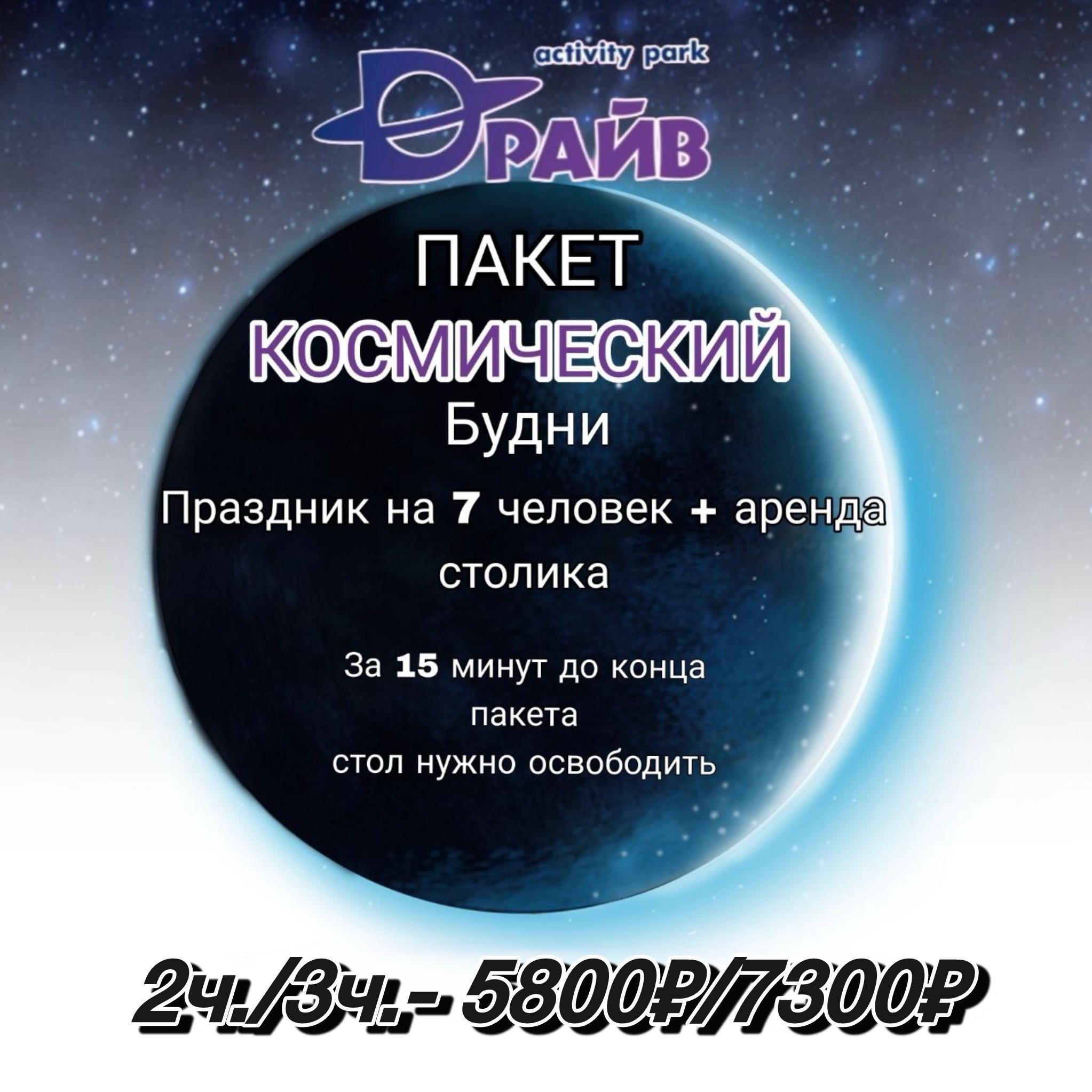 Пакет «Космический» — идеальный выбор для яркого дня рождения! В рамках нашего предложения вы получаете безлимитное посещение аттракционов на выбор: 2 часа всего за 5800 рублей или 3 часа за 7300 рублей. В стоимость включены места для 6 гостей, именинника и уютного арендованного столика. Дополнительные сопровождающие проходят бесплатно! Создайте незабываемые впечатления для своих близких!
